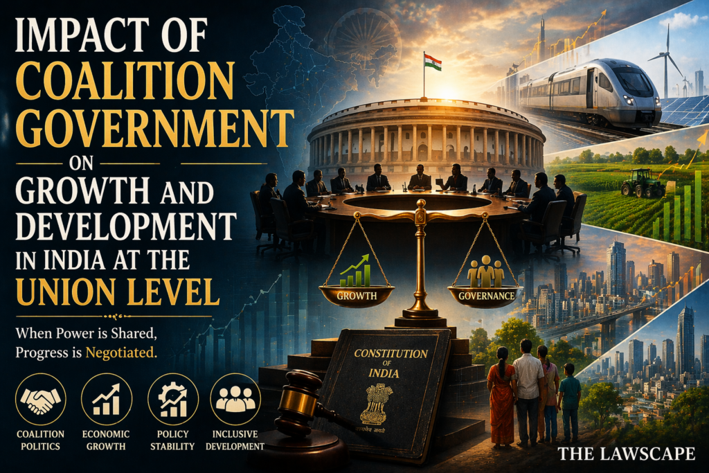 This article examines the impact of coalition governments on the growth and development of India at the Union level, focusing on their political, economic, and governance implications. It explains the concept, types, and features of coalition governments, highlighting how India’s diverse social and regional structure has made coalition politics a recurring feature of parliamentary democracy. The study analyses both advantages and challenges of coalition governance, emphasising consensus-building, power-sharing, and policy compromise as central characteristics. The scope of the article extends to major policy initiatives undertaken during coalition eras, including the LPG economic reforms of 1991, the 1997 Dream Budget, disinvestment and infrastructure reforms, rights-based welfare legislation, and developments in digital governance under the Information Technology Act, 2000. These reforms demonstrate that coalition governments, despite political constraints, have played a significant role in shaping India’s economic liberalisation, social welfare expansion, and institutional modernisation. The article concludes that coalition governments have strengthened democratic representation and inclusiveness while occasionally slowing decision-making due to ideological differences. Overall, coalition politics has contributed to India’s democratic resilience by balancing regional aspirations with national development goals and promoting cooperative governance at the Union level.