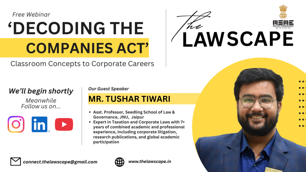 The Lawscape successfully conducted an engaging and informative national webinar titled “Decoding the Companies Act — Classroom Concepts to Corporate Careers” on 16 November 2025. The session was designed to simplify core principles of Company Law and help students connect theoretical learning with real-world corporate practice.