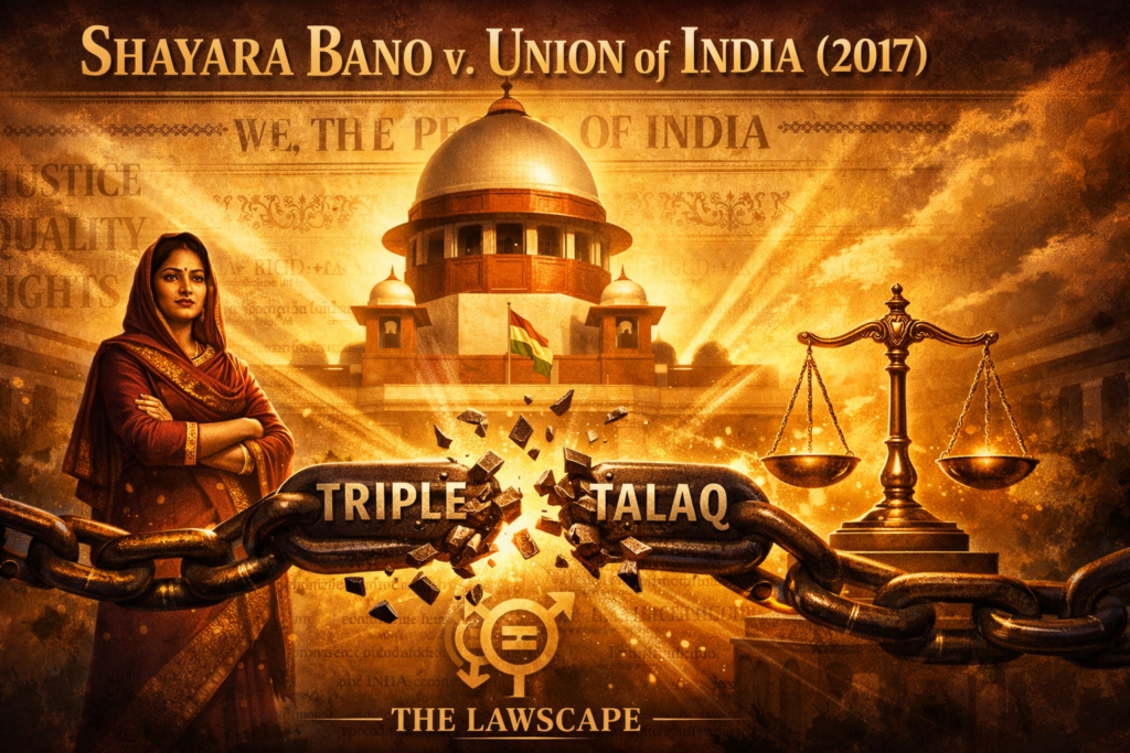Shayara Bano v. Union of India is a landmark judgment delivered by the Supreme Court of India in 2017. The case is popularly known as the Triple Talaq Case. It dealt with the constitutional validity of talaq-e-biddat (instant triple talaq), a practice under Muslim personal law where a husband could divorce his wife by pronouncing “talaq” three times in one sitting.